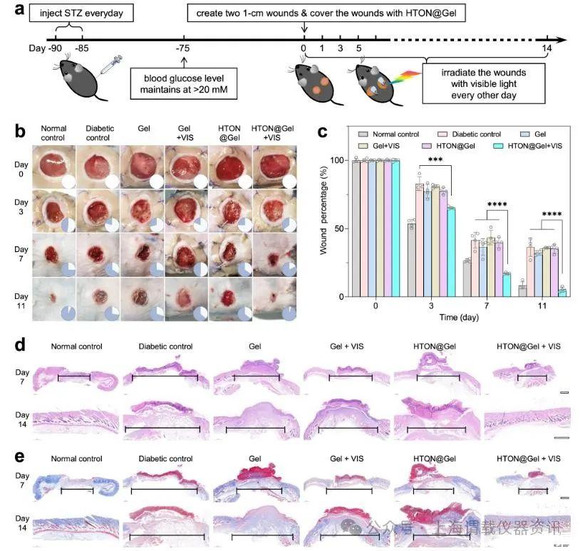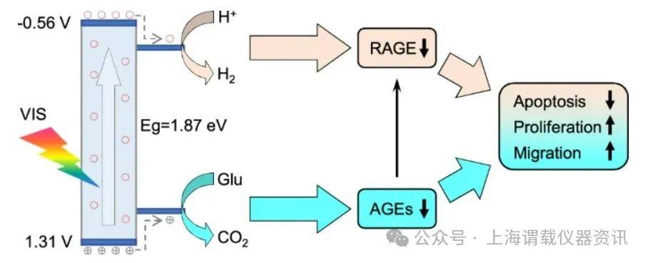 研究簡介:糖尿病足潰瘍(DFU)是糖尿病最常見的慢性并發癥之一,常伴有長期炎癥、自主神經異常和細菌感染,使糖尿病創面難以愈合。高糖微環境在糖尿病創面的發生和進化過程中起著重要作用。通常高糖微環境會促進糖基化,導致一系列副作用,包括慢性炎癥和血管損傷。氫分子已被證明是一種安全有效的抗炎劑,可改善缺血-再灌注損傷,激活皮膚細胞,促進傷口愈合。提出利用腫瘤、關節炎等疾病微環境中的還原性化學因子作為人工催化劑的犧牲劑,通過光催化途徑實現可持續的、可控的制氫,以提高氫治療的療效。近紅外(NIR)光催化有利于深部疾病的氫治療,但近紅外介導的光催化制氫效率普遍遠低于紫外光(UV)和可見光(VIS)。與NIR光催化相比,VIS光催化制氫更適用于糖尿病創面等淺表疾病的治療。本論文研究人員研制了一種金紅石單晶結構的含氫氧化鈦納米棒(HTON),作為具有適當能帶結構的可見光光敏光催化劑,利用葡萄糖作為犧牲劑實現VIS光催化制氫。光催化介導的局部葡萄糖消耗和產氫能夠顯著加速糖尿病創面愈合,為DFU的愈合提供了一種有前途的策略。此外所研制的HTON hydrogel敷料使用方便、安全,具有良好的臨床轉化應用前景。