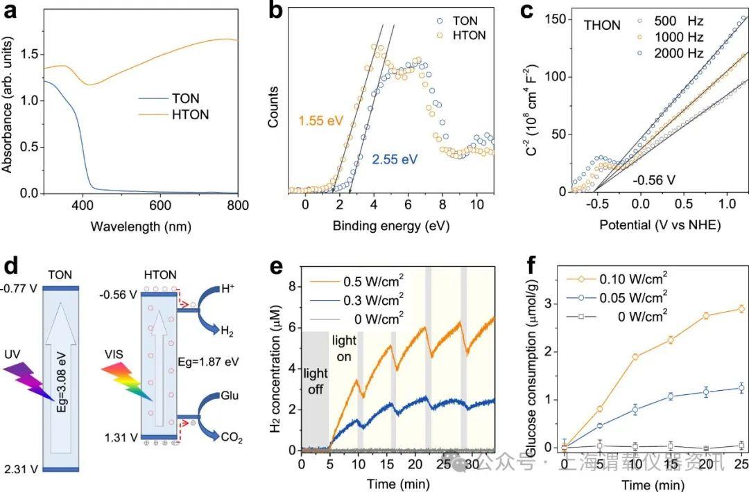 圖4、HTON納米催化劑制氫和耗糖的能帶結構和vis光催化行為。紫外-可見吸收光譜(a),xps測定的TON和HTON的最高占據分子軌道(HOMO)水平(b),HTON的Mott-Schottky圖(c),TON和HTON的能帶結構(與正常氫電極(NHE))以及vis光催化制氫和消耗葡萄糖的機理示意圖(d),在不同功率密度氙燈照射下,HTON納米催化劑在葡萄糖水溶液(20 mM)中的vis光催化制氫(e)和葡萄糖消耗(f)行為(n=3個生物獨立實驗)。