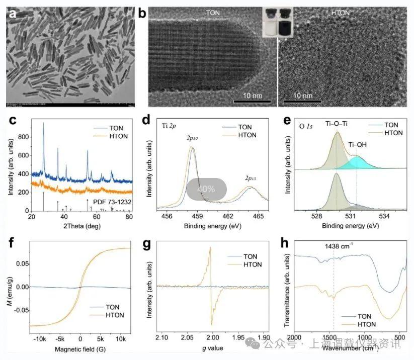 圖2、HTON納米催化劑的形貌、組成和尺寸表征。HTON的TEM圖(a)、HR-TEM圖(b)、XRD(c)、XPS圖(d,e)、VSM圖(f)、EPR譜(g)、FTIR譜(h)。a、b的實驗獨立重復了三次,結果相似。