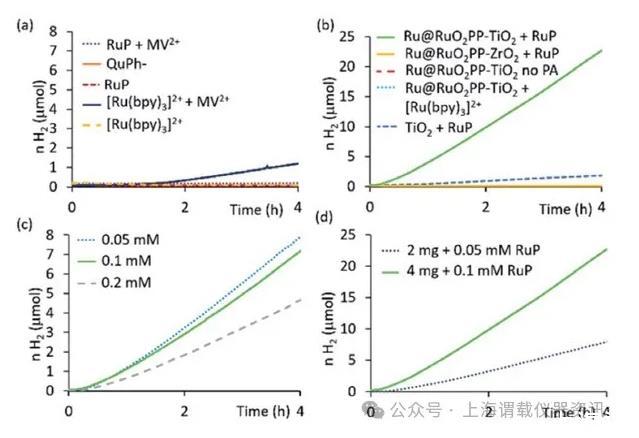 圖2、在4mL(a)中不負載的Ru的RuO2 0.2M的TEOA水溶液的光催化析氫PP與不同的PA(0.1毫摩爾)和(b)負載釕的RuO2 PP-MO 2(M=的Ti,Zr)的含0.1 mM[Ru(bpy)3]2+,0.1 mM RuP,無PA,以及相應的TiO 2-RuP空白;(c)Ru RuO 2 PP-TiO 2(2 mg)光催化析氫中RuP PA濃度的優(yōu)化;(d)在優(yōu)化的Ru RuO 2 PP-TiO 2/RuP比下研究Ru RuO 2 PP-TiO2濃度。