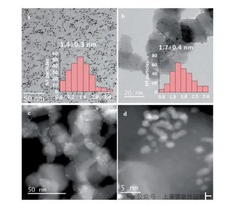 圖1、(a)RuPP納米粒子的TEM圖像和相應的尺寸直方圖,(b)Ru RuO2 PP-TiO2的TEM圖像和相應的尺寸直方圖,(c)和(d)Ru RuO2的HAADF-STEM圖像PP-TiO2。