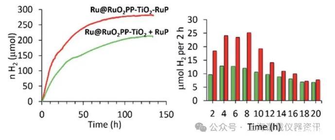 圖3、Ru RuO 2 PP-TiO 2(4 mg)+[RuP]=0.1 mM(綠色)和Ru RuO 2 PP-TiO 2的光催化析氫曲線(左)和每2小時析氫速率(右)-可見光照射下的RuP(紅色),在4 mL 0.2 M TEOA水溶液中,pH值為7。