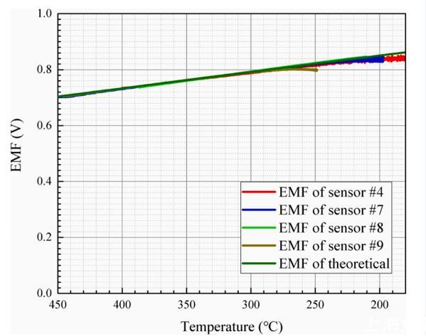分別對傳感器4、傳感器7、傳感器8和傳感器9在氧飽和LBE下進行低溫試驗。四個氧傳感器的具體信息如表1所示,低溫極限測試結果如圖6所示。從圖8中深黃色的電動勢曲線可以看出,當溫度低于270℃時,傳感器9開始偏離理論值。亮綠色曲線顯示,傳感器8在整個測試溫度范圍內都能正常工作,其最低測試溫度為210℃。藍色曲線和紅色曲線分別代表傳感器7和傳感器4的工作電動勢。兩條曲線的變化趨勢表明,當兩個氧傳感器的溫度低于200℃時,電動勢偏離理論值。根據四種氧傳感器的低溫極限溫度測試結果,可以認為LSCF/空氣傳感器在低溫區域仍能穩定準確地輸出LBE與參考側氧濃度之差所產生的電動勢。本實驗的溫度范圍基本覆蓋了非等溫LBE體系的低溫區域,實驗數據為氧傳感器的應用提供了重要的參考價值。