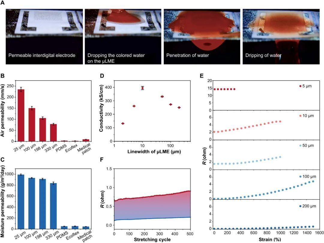 在大尺寸、可滲透和可拉伸的纖維氈上成功制備μLMEs,為高密度、集成、可植入和長期生物相容的LM電子器件鋪平了道路。目前,μLMEs通過配備實驗室的光刻技術(shù)顯示出2μm的典型圖案化分辨率,透濕率為990 g/m2每天,設(shè)備密度超過75,000個電極/厘米2,電導(dǎo)率約為105S/cm,拉伸性高達1500%的應(yīng)變。原則上,μLME的圖案化分辨率可以進一步提高到亞微米(0.25至1μm)區(qū)域,例如,通過使用高分辨率光刻工具和較小纖維直徑的纖維氈。