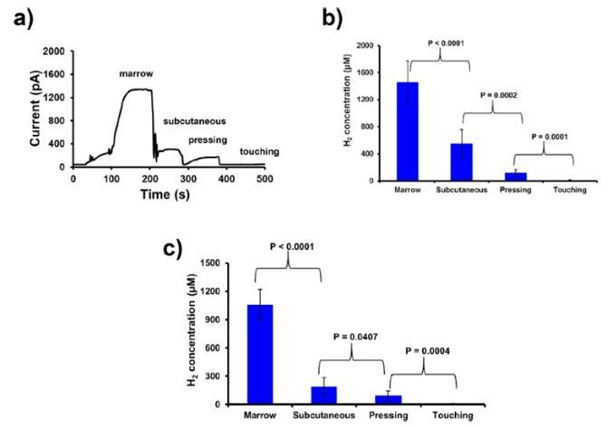 圖3、Mg植入體材料應用于麻醉兔內骨折區域后對應的H2的測定。(a)氫氣傳感器的電流信號與皮下測量骨髓中H2濃度的時間關系,鎂植入1周后,取一只具有代表性的家兔,由左至右按壓皮膚,輕輕觸摸皮膚,經皮給藥。(b)所有實驗的7只兔子在植入鎂后1周后對骨折區域4個點測量的平均H2濃度。(c)植入Mg固定裝置2周后,7只家兔體內不同位置處對應的H2平均濃度。