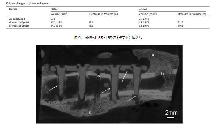 圖5、用鎂板和螺釘固定術后4周后切除的尺骨具有代表性的微ct切面,截骨部位(o)保留可見,但也可見老繭形成(c)。H2監測孔位置處(h)現在充滿了重新生長的骨頭。在板上(實心箭頭)和螺釘處(虛心箭頭)的器件出現明顯的退化。