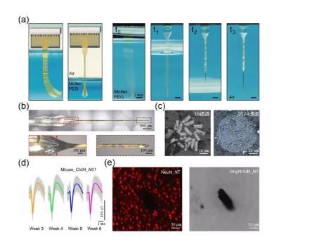 中科院腦科學與智能技術卓越創新中心、國家納米科學中心方英研究員和神經科學研究所李澄宇研究員及其團隊研發了名為“神經流蘇”的技術,通過將上千根與神經元突觸尺寸接近柔性神經纖維電極浸入在聚乙二醇液體中,利用表面張力聚合“流蘇”,待成功植入并降解代謝聚乙二醇后,柔性神經纖維電極自動釋放。此方法通過優化植入方式來增加腦內纖維電極的數量。