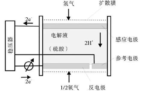 電流型氫氣傳感器在商業(yè)應用中比較常見,其通過對氫氣進行電化學反應,從而產(chǎn)生與氫氣濃度成正比的電流。電流型氫氣傳感器主要由3部分組成(圖1)。第一部分是發(fā)生電子轉移的電極,通常包括兩個電極——工作或感應電極和反電極。第二部分為電化學電池,包含固體或液體電解質,以允許離子在電極之間傳輸。第三部分為氣體滲透層,覆蓋了連接到感應電極的入口,并有助于限制擴散,從而使其成為決定速率的步驟。