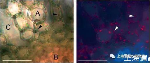 圖2、取自于水生植物Meionectes brownii,采用橫切手段的一段水生根系,其橫截面交界處的口徑為50-100毫米。其中圖a表示的是在明亮的光照下植物根系細(xì)胞組織分布情況,其中A區(qū)域表示的是皮層細(xì)胞;(B)區(qū)域表示的植物根系的內(nèi)皮層以內(nèi)的中軸部分;(C)區(qū)域表示的是通氣組織。圖b表達(dá)額是皮層細(xì)胞含有橢圓的綠色色素體(箭頭所指),圖中顯示的熒光紅色區(qū)域是用紫外光激發(fā)產(chǎn)生的,圖中的白色長條部分表示的長度是50 um。