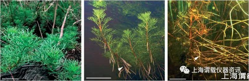 圖1、水生植物Meionectes brownii(a)陸生形態(tài)下;(b)剛被淹沒的Meionectes brownii植物的狀態(tài),可以看見有新的水生根生長(白色箭頭所指);(c)被浸泡幾個(gè)月的水生植物Meionectes brownii,從圖中可以看出該植物的一個(gè)根系(白色箭頭所指)出顯示了廣泛的水生植物根系生長現(xiàn)象。