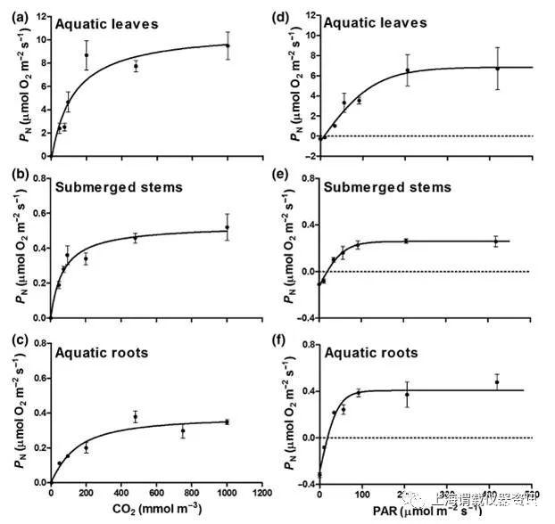 圖3、溶解性CO2(a-c)和光照(d-f)變化的影響下,切除器官的水生植物Meionectes brownii的水下凈光合作用情況分析(PN)。在整個(gè)表面積的基礎(chǔ)上(即葉片的兩邊)表示出速率,因此可以在其各器官之間進(jìn)行直接比較。例如二氧化碳響應(yīng)測量,光合成有效輻射(PAR)是430±7umol m-2s-1、測量溶解了500mmol m-3的二氧化碳光響應(yīng)。所有的測量都是在20C下進(jìn)行的。測量值擬合是基于希爾-維頓頓方程(a-c)上;r2=0.91-0.96)或雙曲正切方程(d-f;r2=0.97-0.99)。