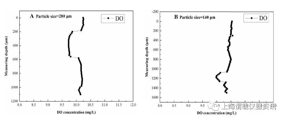 圖2、活性污泥絮體中的溶解氧分布。從圖中可以看出選擇活性污泥樣品,在清水條件下研究粒徑對(duì)氧傳質(zhì)的影響。通過用微電極測(cè)量單個(gè)絮體,DO濃度隨著絮體的測(cè)量深度顯示出“凹”趨勢(shì),表明DO不斷被絮體中的氧氣轉(zhuǎn)移衰減和消耗。這種衰減部分是由于微生物的呼吸作用,部分是由于擴(kuò)散阻力引起的傳質(zhì)損失。溶解氧濃度以絮體中心為對(duì)稱點(diǎn)對(duì)稱分布。當(dāng)微電極穿透絮狀物時(shí),溶解氧濃度恢復(fù)到與液相一致。