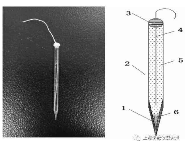 圖1、離子選擇性液膜微電極結(jié)構(gòu)示意圖。(1.硅烷化后的電極頭;2.毛細(xì)玻璃管(外徑1.5-1.6毫米,長(zhǎng)度100毫米);3.AB塑料頭;4.銀/氯化銀內(nèi)參電極;5.內(nèi)參液;和6.離子選擇性液膜)。