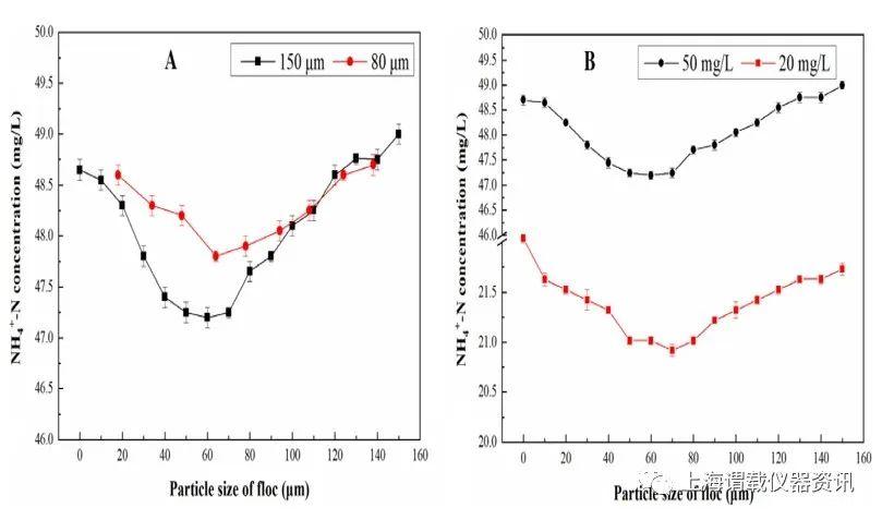 圖4、不同粒徑條件(A)和不同外部NH4+-N濃度(B)下絮體中NH4+-N的變化規(guī)律。如圖A所示,隨著粒徑的增大,NH4+的衰減值逐漸增大。當(dāng)粒徑約為150μm時(shí),NH4+-N的衰減值約為1.5 mg/L。當(dāng)粒徑減小80μm時(shí),NH4+-N的衰減值約為0.7 mg/L。