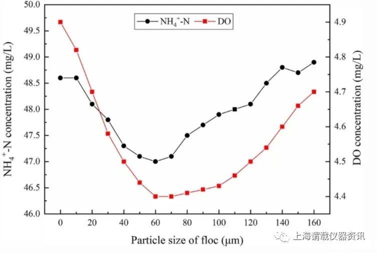 圖5、氨氮和溶解氧在絮體內(nèi)部的分布比較。如圖所示,當(dāng)絮體粒徑約為150μm時(shí),絮體中NH4+的衰減小于DO。因此,與NH4+相比,DO更有可能是限制硝化反應(yīng)的關(guān)鍵因素。