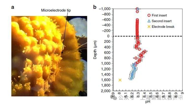 圖1、a)表示的是應(yīng)用微電極測試珊瑚體表面以及珊瑚體腔內(nèi)的pH的實(shí)驗(yàn)過程實(shí)驗(yàn)圖b)表示的是使用氫氣微電極測試珊瑚蟲體表以及體內(nèi)的pH獲取的其pH剖面圖,其中紅色圓圈表示的是第一次測試,藍(lán)色三角形表示的是第二次測試,黃色小說的是測試電極折斷。從圖中可以看出,在珊瑚蟲體表面的pH大于珊瑚蟲體內(nèi)的pH,并且離珊瑚蟲表面越遠(yuǎn),其pH值越小,越靠近表面,其pH值越大。
