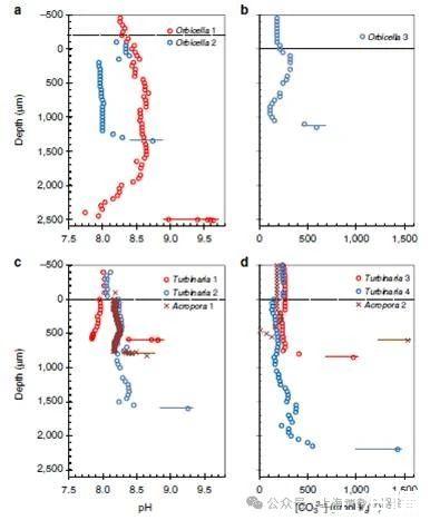 圖3、珊瑚蟲體內(nèi)部的pH以及碳酸根的剖面分析圖。其他圖a表示的是圓形珊瑚體內(nèi)不同位置處測試的珊瑚蟲體內(nèi)的pH分布圖,圖b表示的是圓形珊瑚體碳酸根離子濃度的剖面圖。圖c表示的是甲狀珊瑚蟲和高頂珊瑚蟲體內(nèi)的pH剖面圖。圖d表示的是甲狀珊瑚蟲和高頂珊瑚蟲體內(nèi)的碳酸根離子濃度剖面圖。從圖中可以看出,珊瑚蟲體內(nèi)的pH較小,而珊瑚體內(nèi)的碳酸根離子濃度呈現(xiàn)離珊瑚表面越遠(yuǎn)其濃度變大。