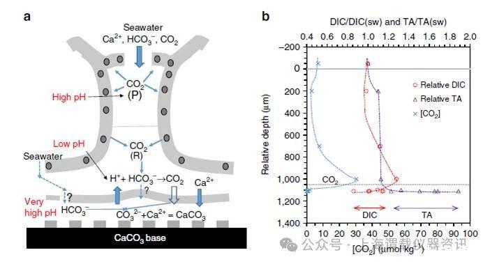 圖4、a)表示的是珊瑚蟲體內(nèi)鈣化機(jī)制以及海水中的二氧化碳是如何擴(kuò)散進(jìn)入珊瑚腔體的概念模型圖。圖b表示的是所測試珊瑚體不同位置處的溶解性無機(jī)碳(DIC)、二氧化碳濃度的分布示意圖。從圖a可以看出,珊瑚腔體內(nèi)的pH較小,而靠近珊瑚腔體外pH值較大。