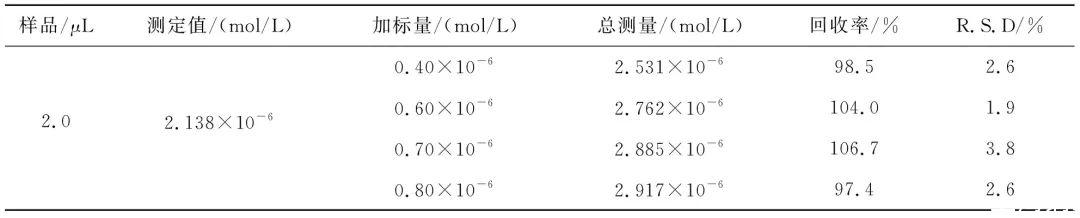 將在張仲景大藥房購買的中藥姜黃在研缽中充分研磨成粉末,準確稱取1.0020 g粉末于小燒杯中,加入10 mL乙醇,保鮮膜封口,超聲震蕩1 h;離心提取液,重復上述提取步驟2次。最后將3次提取液混合在一起,水浴加熱蒸發至10 mL,留著樣品使用。用pH=3.0的0.1 mol/L PBS溶液作為支持電解質,用實驗方法進行測定,然后加入一定量1.0×10-3 mol/L的姜黃素標準溶液,做回收率實驗,結果如表1所示。實際樣品測定的回收率在97.4%~106.7%之間,計算可得所購買的中藥材姜黃中姜黃素的含量為3.93%(姜黃中姜黃素的含量在3%~6%的范圍)。