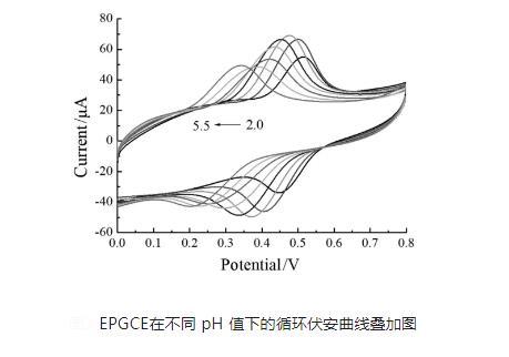 用細打磨紙和0.5μm的氧化鋁粉末研磨液打磨電極,把電極表面處理成光面;然后,用純凈水沖洗干凈;再用純凈水和乙醇超聲波震蕩,直至徹底清洗干凈;最后烘干,記為裸玻碳電極。將處理后的玻碳電極放到pH=7.0的0.10 mol/L的PBS溶液中,在~1.5 V~2.5 V的電位下用循環伏安法處理2圈,得到電化學處理后的玻碳電極(EPGCE)。