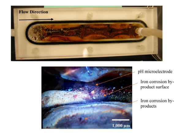圖1、155 d時球墨鑄鐵試片電池的數字圖像(頂部)和155 d時使用pH微電極進行分析時球墨鑄鐵試片的圖像(底部)。