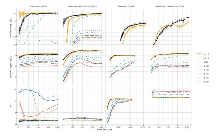 圖4、實驗A(pH 7,無正磷酸鹽)在183 d時位置1(位置1)和位置2(位置2)的游離氯、溶解氧和pH曲線及其標準差,實驗B(pH 7,3 mg PO4/L正磷酸鹽)在190天,實驗C(pH 9,無正磷酸鹽)在154天,實驗D(pH 9,3 mg PO4/L正磷酸鹽)在155天還顯示了每個實驗能夠在5到30分鐘內獲得的結果。位置1和2剖面是在流動過程中收集的,停滯剖面是從位置2收集的。