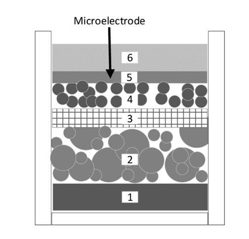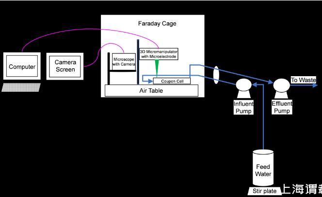 使用Unisense(丹麥)pH-10型(尖端直徑為10μm)的pH微電極收集pH曲線。在每次實驗之前,用pH 7和10緩沖液校準pH微電極。在進行微電極剖面分析實驗時,將試樣單元從試樣老化設置移至試樣分析設置中。將試樣單元放置在法拉第籠的空氣臺上,以限制剖析實驗期間的振動和電氣干擾。通過蠕動泵(2 mL/min)從2 L鋁箔覆蓋的量筒中進料具有相同成分的水,并通過不銹鋼針和第二個蠕動泵(2 mL/min)通過抽吸去除以保持流量。將微電極安裝在三維(3D)顯微操縱器中,連接到微電極萬用表,并使用SensorTrace Pro軟件(Unisense,丹麥)進行控制。使用帶有攝像頭的顯微鏡來觀察微電極的運動并確定試樣表面上方的水深。在測量穩態剖面之前,將試樣細胞馴化45分鐘。試樣細胞馴化后,使用用過的微量試劑測定從塊狀水面到金屬試樣表面的水深。確定了鐵沉積物或銅試樣的表面,用過的微電極替換為校準過的微電極。在試樣表面上的兩個位置(位置1和2)獲得了DO和pH值的平均一式三份微觀剖面測量值。