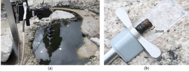 圖1、采樣點和以藍細菌為主的微生物墊的照片。(a)日本中房溫泉“溪流遺址”發育的深藍綠色微生物墊。(b)每個時間點收集的微生物墊核心樣品的直徑為8毫米,面積約為100毫米,15毫米厚。本研究中使用了巖心樣本的上部3毫米。