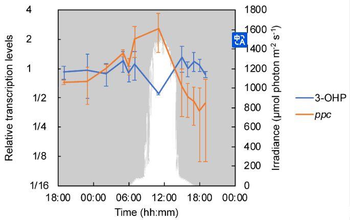 圖5、藍藻墊中編碼3-OHP雙循環關鍵酶和回補途徑相關酶的基因的相對轉錄水平。關鍵3-OHP酶(即丙二酰輔酶A還原酶(Cagg_1256)和丙酰輔酶A合酶(Cagg_3394))以及磷酸烯醇丙酮酸羧化酶(ppc、Cagg_0058和0399)的相對轉錄水平的平均值由藍色表示線和橙色線,分別具有標準偏差。下降光子輻照度(PAR;400–700 nm)以白色表示。