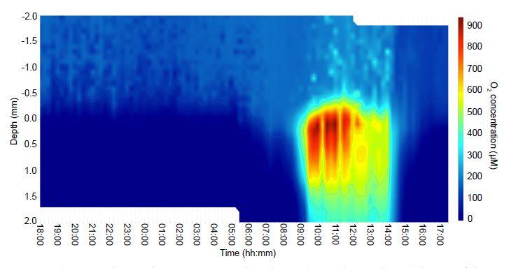 圖2、在晝夜循環中測量的中房溫泉以藍細菌為主的微生物墊中垂直O2濃度分布的熱圖。從11月3日18:00到18日,在24小時內每隔15分鐘測量一次O2濃度(μmol L?1)作為微生物墊深度的函數:11月4日00點。墊子表面用0毫米表示。正深度值表示墊子表面以下的深度,負值表示墊子表面以上的深度,即到溫泉上覆水柱的距離。