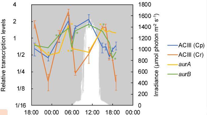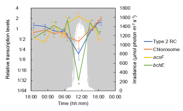 圖3、編碼光合反應中心和葉綠體蛋白的基因以及參與細菌葉綠素生物合成的基因的相對轉錄水平。編碼2型反應中心(RC)(pufLMC:Cagg_1639–1640和Cagg_2631)和葉綠體蛋白(csmAMNOPY:Cagg_1222、Cagg_1209、Cagg_1208、Cagg_2486、Cagg_1206和Cagg_1296)的基因平均值由藍線和橙色線表示。顯示了Mg-原卟啉IX單甲酯需氧環化酶(acsF,Cagg_1285,黃線)和厭氧環化酶(bchE,Cagg_0316,綠線)的值。下降光子輻照度(光合有效輻射[PAR];400–700 nm)以白色表示。星號表示某個時間點顏色對應的特定基因的轉錄與前一個時間點的轉錄顯著不同。