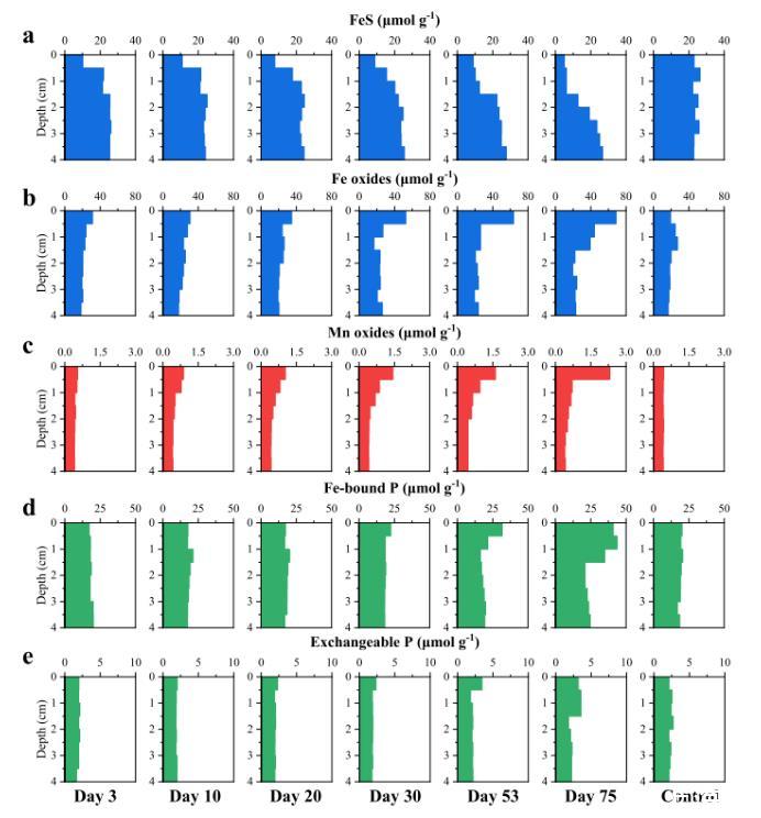圖5、有氧培養巖心中沉積FeS(a)、Fe氧化物(b)、Mn氧化物(c)、鐵結合P(d)和可交換P(e)深度剖面的時間變化。對照核心(第75天)繪制在右側以供參考。