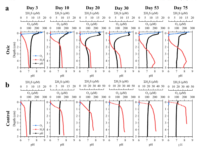 圖1、在培養過程中,充氣處理(a)和對照處理(b)中O2、pH和∑H2S深度分布的時間變化。在整個培養過程中,SAD逐漸增加,產生一個明顯的低氧區,其中O2和∑H2S無法檢測到。在第20天,沉積物頂層的pH值出現明顯峰值,同時較深沉積物的pH值大幅下降。而在缺氧對照處理中,在整個培養期內沒有觀察到低氧區和典型的電纜細菌活性的pH指紋。