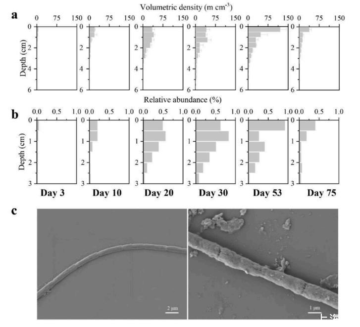 圖3、通過FISH(a)和16S rRNA基因測序(b)量化的有線細菌深度分布的時間變化及其在毒性處理中的豐度,以及孵育30天后1.0-1.5 cm沉積物間隔的電纜細菌絲的SEM圖像(c)。