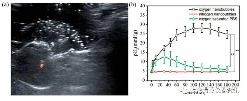 在超聲成像的指導下,將氧氣微電極插入老鼠的腫瘤組織內,通過直接測量瘤內氧水平來評估納米氣泡的氧傳遞和瘤內氧水平的增強。用氧微電極傳感器記錄特定時間間隔注射氧納米微氣泡后后3小時腫瘤內氧分壓(pO2)。