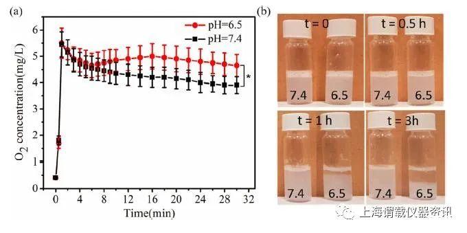 圖3、a)在pH 6.5和7.4下培養的氧納米微氣泡的體外氧釋放動力學,(b)儲存在中性溶液(pH 7.4)和酸性溶液(pH 6.5)中3小時的氧納米微氣泡的樣品照片。