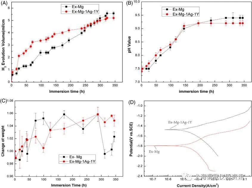 圖1、Mg-1Ag-1Y合金和Mg移植體樣品在1×PBS中動態降解隨時間變化的曲線圖:(a)析氫體積,(B)1×PBS的pH值,(C)試樣重量變化,(D)電位的動態極化曲線圖。