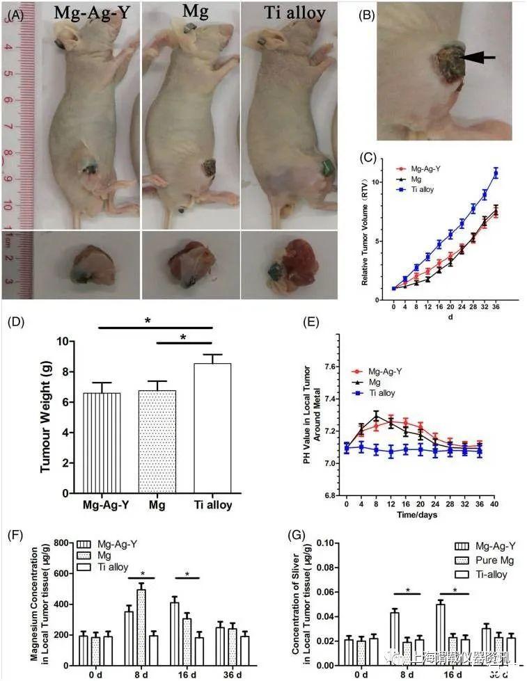 圖2、A:裸鼠經前Mg-1ag-1y合金、純Mg、Ti合金原位植入5周后,肉眼觀察后肢局部腫瘤。B:放大局部腫瘤,在Ex-g-1Ag-1Y合金和純Mg(黑色箭頭)植入物表面可見纖維包膜。(C)三組不同時間點局部腫瘤周圍的RTV曲線和pH值。D:植入不同金屬材料的裸鼠處死后取腫瘤重量。E:術后第0天、第8天、第16天、第36天局部腫瘤組織中鎂的含量。G:術后第0天、第8天、第16天、第36天腫瘤組織銀(Ag)水平。