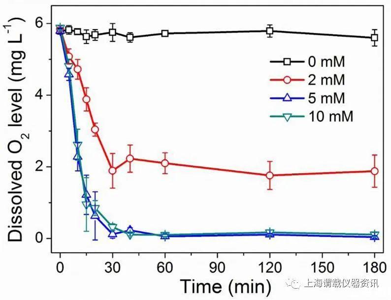圖3、酸化的DMEM營養基中(pH=6.5)加入不同濃度(0 mM、2mM、5mM、10mM)的脫氧劑MS-NPS后,體系中氧氣濃度隨時間的變化情況。從圖中可以看出,脫氧劑MS-NPS加入會引起體系中的氧氣濃度迅速降低,在30分鐘后,體系中的氧氣濃度就處于平衡了,而脫氧劑MS-NPS的濃度越大,體系中的氧氣濃度越小。但是當脫氧劑濃度增加到一定濃度時(10mM),其氧氣濃度就幾乎不變了。