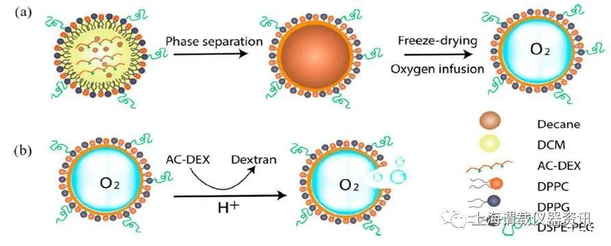 圖1.pH響應型氧納米微氣泡制備和pH觸發型氧釋放劑的示意圖。圖a表示的是以AC-DEX為外殼制備ph響應型納米氣泡。將含有AC-DEX和癸烷的二氯甲烷溶液在由DPPC、DPPG和dsp-peg組成的脂質溶液中乳化,制備納米乳劑。在相分離、冷凍干燥和輸氧之后,就形成了氧納米微氣泡。圖b表示的是水溶性葡聚糖中AC-DEX的酸催化水解在酸性環境中pH引發納米微氣泡的氧釋放。