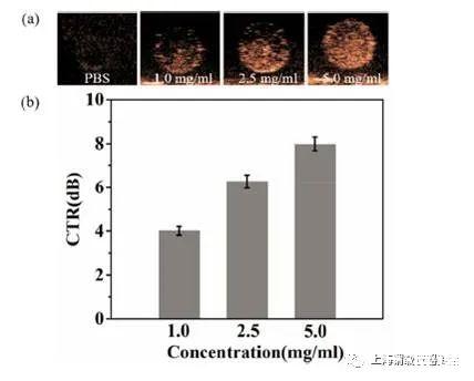 圖2、氧納米氣泡的體外超聲成像。(a)不同濃度的氧納米泡溶液的超聲圖像(b)圖中超聲圖像的組織對比(CTR)