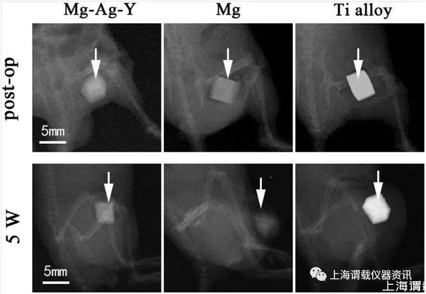 圖3、三組小鼠后肢在不同時間點的x線成像。白色箭頭表示植入金屬。