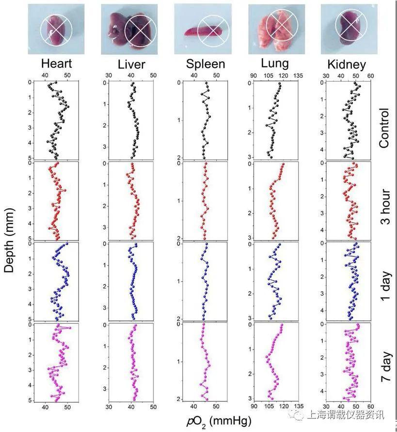 圖4、小鼠中注射高劑量MS NPs(100mg/L)和未注射MS NPs不同組織器官(心臟、肝、脾臟、肺、)的在不同時間段微表面氧分壓剖面分析圖。從圖中可看出,老鼠各器官組織中的氧分壓值未出現較大的波動。