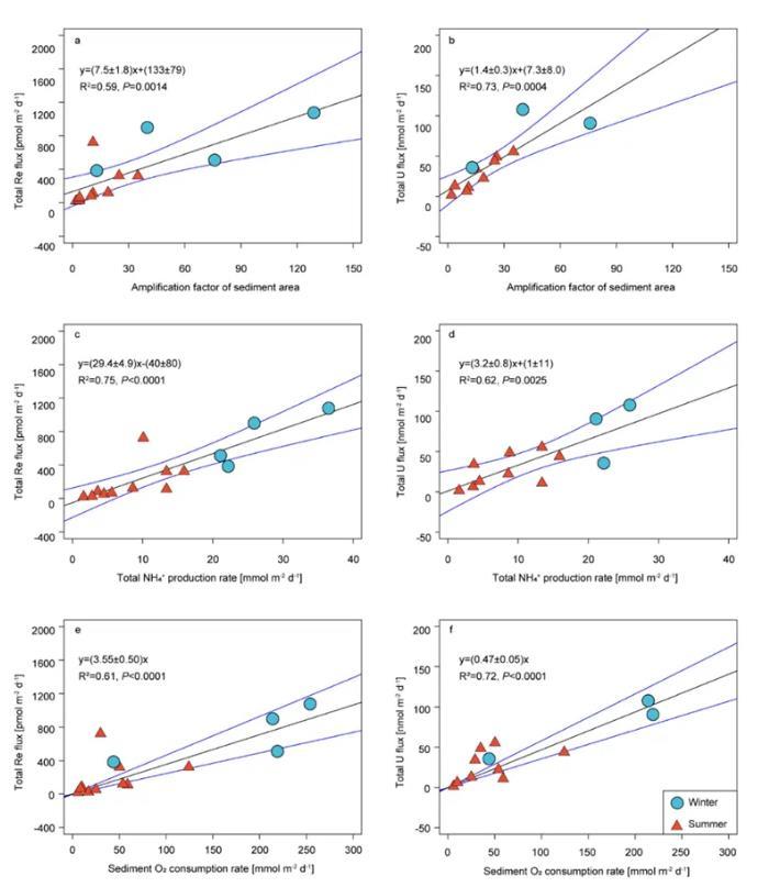 圖1.陸架沉積物Re和U通量與沉積物浸灌作用系數(shù)(a, b)、有機(jī)碳厭氧分解速率(c、d)和沉積物耗氧速率(e , f)的相關(guān)性