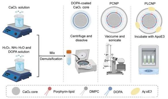 多形性膠質(zhì)母細(xì)胞瘤(GBM)患者預(yù)后不佳的主要原因是手術(shù)干預(yù)后殘留的高度侵襲性腫瘤。精確術(shù)中成像和術(shù)后殘余清除技術(shù)的發(fā)展將有助于GBM的完全消除。在這里,上海交通大學(xué)醫(yī)學(xué)院藥理與化學(xué)生物學(xué)系高小玲教授和鄭剛教授合作開發(fā)了一種自分解卟啉脂蛋白包被的過氧化鈣納米顆粒(PLCNP),通過巨噬細(xì)胞作用靶向GBM,允許熒光引導(dǎo)的GBM手術(shù),并通過減輕缺氧來改善GBM殘留的光動力治療(PDT)。通過減少自猝滅和提高溶酶體逃逸效率,過氧化鈣(CaO2)核在PLCNP中的摻入放大了卟啉脂質(zhì)的熒光強(qiáng)度。此外,CaO2核心減少了腫瘤缺氧,提高了PLCNP的PDT療效,實現(xiàn)了低劑量的PDT,逆轉(zhuǎn)了PDT后缺氧加重引起的腫瘤進(jìn)展。