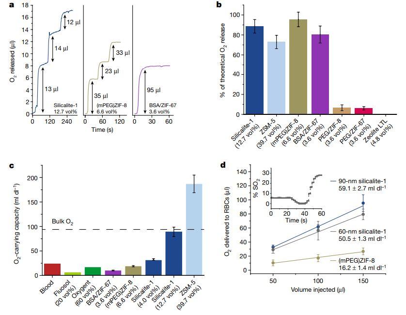 圖4、水和血液中的O2釋放測量。a)將氧化硅沸石、(mPEG)ZIF-8和BSA/ZIF-67納米晶體溶液注入脫氧水中的O 2釋放動力學。b)疏水沸石和MOF納米晶體的含氧水溶液相對于理論量的O2量,該理論量是通過假設氣體容量與固態(tài)測量值相當?shù)耐耆稍锏目紫队嬎恪)疏水性沸石和MOF納米晶體的水溶液的O 2攜帶能力與血液的O 2攜帶能力的比較。d)(mPEG)ZIF-8(6.7 vol%)和硅質(zhì)鹽納米晶體(9.1 vol%和11.0 vol%60 nm和90 nm納米晶體,分別)作為注入溶液體積的函數(shù)。b–d中的誤差線表示與每個數(shù)據(jù)點的至少三個獨立測量值相關(guān)的標準偏差。