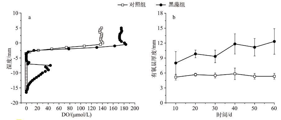 圖2沉積物-水界面DO垂直剖面變化(培養(yǎng)40 d)(a)和有氧層厚度變化(b)