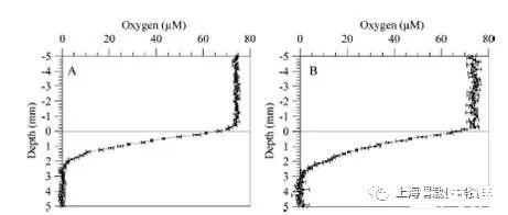 圖4、在俄勒岡州的海底邊緣(110米水深)的現場同時測量獲得了兩組氧氣剖面數據,使用了尖端外徑為25 um的克拉克型微電極(Unisense OX-25傳感器)。圖中每個樣本點數據代表的是延遲1秒后取的5個讀數平均值。傳感器A的平均信噪比較與傳感器B高,氧微電極傳感器測試產生了一個剖面圖,其中關于的氧深度為零的問題得到了更大的確定性。