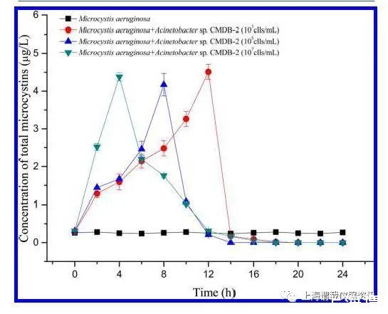 圖5、體系中含有不同的初始細菌密度條件下,微囊藻菌屬FACHB905動態MC-LR微囊濃度的和不動桿菌中的動態濃度變化。圖中顯示的數據代表了是實際測試值三倍的平均值。