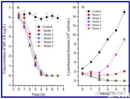 圖1、(a)MC-LR(微囊藻素)濃度和(b)細菌隔離實驗中微囊藻細胞密度的動態變化。數據代表是實際測試后三倍的平均值。